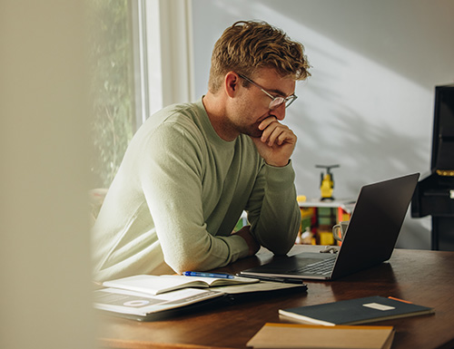 For example, if you have a webpage announcing a product launch, you may include an image like this: a man sitting at a desk, leaning toward his laptop and looking intently at it, with an open notebook and a book to his right.